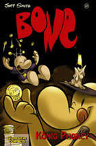 König Phoney Als die Bones damals aus ihrer Heimatstadt vertrieben wurden, weil Phoncible P. Bone ein krummes Geschäft zuviel gemacht hatte, ahnten sie nicht, mit welchen dunklen Mächten sie es künftig noch zu tun haben werden. Beim Verlassen der Grenzen der ihnen bekannten Welt verirrten sich die kleinen Wesen mit den lustigen Gnubbelnasen. Ein vorbeiziehender Heuschreckenschwarm, der später noch an Bedeutung gewinnen sollte, trennte die drei Vettern. Geizhals Phoney blieb mit dem etwas unterbelichteten, aber stets gut gelaunten Smiley verschollen, während der liebenswerte Fone Bone in einer anderen Welt landete- einer Welt voller Geheimnisse und faszinierenden, aber auch gefährlichen Wesen. Schnell machte Fone Bone Bekanntschaft mit der Wanze Ted, aber auch mit den Rattenmonstern, die ihn gerne verspeist hätten, wäre da nicht der große rote Drache gewesen. Fone Bone war einer der wenigen, dem sich der legendäre rote Drache zeigte. Es schien ganz so, als würde er unter dessen Schutz stehen und als wüsste der mächtige Drache alles über ihn... Die Wanze Ted brachte Fone Bone zu einem Mädchen namens Thorn und ihrer Großmutter Rose, wo er den Winter verbringen konnte. Zusammen mit Thorn, in die er noch immer unsterblich verliebt ist und Großmutter Buster begab er sich auf die Suche nach seinen Vettern mit dem Ziel, bald nach Boneville zurückzukehren. Seit diesen Ereignissen sind nun siebzehn Bände vergangen, aber zurück in Boneville sind Fone Bone, Smiley und Phoney immer noch nicht. Ganz im Gegenteil: Inzwischen ist sehr viel geschehen und nachdem das Geheimnis des Verhüllten gelüftet wurde, befinden sich unsere Protagonisten nun in der alten Königsstadt Atheia, wo man jederzeit mit einem Krieg zwischen Gut und Böse rechnen muss. Das unbeschwerte Mädchen Thorn ist mittlerweile zu einer jungen Frau herangereift, die eine große Verantwortung zu tragen hat. Doch der tapfere Fone Bone scheut keine Gefahren und wird ihr in einer Welt umgeben von Todesringen und bösen Träumen immer zur Seite stehen. Während die Dorfbewohner von Bumper Hill immer noch an den Geisterkreisen vorbei müssen, entwickelt Phoney ein wahrhaft majestätisches Sendebewusstsein und setzt dabei die Sicherheit seiner Freunde aufs Spiel. Vor allem Thorn befindet sich in größter Gefahr. Der Verhüllte, treu bewacht von seiner Rattenmonster- Armee, hat sich mit den Generälen von Pawa verbündet, die nun das magische Tanengard besetzen. Für den Fall, dass die Drachen doch wieder auftauchen und den Atheianern zu Hilfe eilen sollten, hat der Verhüllte Kontakt zu einem alten Bekannten aufgenommen... Während sich außerhalb der Mauern von Atheia die Soldaten aus Pawa nähern, geht von Lord Tarsil innerhalb der alten Königsstadt Gefahr aus. Nachdem Königin Rose mit ihrer Enkelin vor Jahren ihre Heimatstadt verließ, um der jungen Thorn nach all den schrecklichen Ereignissen ein normales Leben in der Anonymität zu ermöglichen, riss der ehemalige Hauptmann der Garde der Königin in Atheia die Macht an sich. Thronräuber Tarsil, der früher häufig die Autorität der Drachen herausforderte, weiß inzwischen von der Ankunft der Thronerbin. Er befiehlt seinen Männern, die junge Prinzessin zu verhaften und sie zu ihm zu bringen. Denn er plant Grausames mit Thorn... In Amerika wurde das Gesamtkunstwerk der besonderen Art gleich mehrfach mit allen wichtigen Preisen der Comicwelt ausgezeichnet- darunter acht Eisner- und fünf Harvey- Awards sowie der Genie- Award. Außerdem konnte Jeff Smith in den Jahren 1995 und 1996 Preise für das beste deutschsprachige Comic- Buch des Jahres und das beste ausländische Album entgegennehmen. 1999 folgte schließlich der renommierte italienische Yellow Kid.
