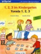 Obwohl dieses kleine Buch wirklich dünn ist, beherbergt es eine Menge Möglichkeiten: Einerseits erzählt es vom Kindergarten. Dabei bekommt ein Kind einen Einblick in den Alltag. So ganz nebenbei lernt es aber auch das Zählen, denn auf Seite 1 wird diese Zahl hervorgehoben, entweder als einzelne Gegenstände, die im darüberliegenden Bild wiederzuentdecken sind, oder als arabische Zahl. Das gilt für alle Zahlen von 1 – 10. Außerdem liegt dieses Büchlein als zweisprachige Literatur vor, die deutsche Sprache ist in blauer Schrift und die weitere Sprache ist meist darunter in schwarzer Schrift.