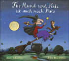 Für Hund und Katz ist auch noch Platz Dieses Werk unterscheidet sich bereits durch sein märchenhaftes Cover von den meisten anderen Bilderbüchern. Eine wundervoll glänzende Schrift mit silbernen Sternen verziert das Bild der freundlichen Hexe, die sich mit Besen, Katze sowie Zauberstab auf eine Erlebnisreise begibt. Auch ihren Hexenkessel trägt sie immer bei sich. Zusammen mit ihrer Freundin, der Katze, fliegt sie vergnüglich an Wäldern, Bergen und sonderbaren Tieren vorbei, bis sie ihren Hexenhut verliert. Ohne ihn kann es nicht weitergehen. Also muss kurzum eine Notlandung eingelegt werden. Zum Glück findet ein Hund den Hut im Gebüsch und die Hexe ist nun wieder komplett. Die Reise wird fortgesetzt und der kleine Hund zum Dank mitgenommen. Die zerstreute Hexe ist ein richtiger Pechvogel. Ständig verliert sie etwas auf dem Flug durch die Lüfte. Ständig müssen sie anhalten, um nach dem verlorenen Gegenstand zu suchen. Nach jeder Rast wird ein neuer Gefährte mit auf die wundersame Abenteuerfahrt genommen. Zu fünft macht es einfach mehr Vergnügen... Doch als der Besen entzwei bricht, scheint die Reise endgültig beendet. Wie aus dem Nichts taucht ein gigantischer roter Drache auf mit Flügeln und einem Horn in der Mitte des Kopfes. Er hat Hunger. Er will sie fressen. Will Hexe mit Pommes zum Abendessen. Doch was ist das? Aus den Sümpfen steigt plötzlich ein noch viel grösseres, gefährlicheres Ungeheuer auf und der Drache bekommt Angst. Blitzschnell ergreift er die Flucht. Jetzt sieht man ihn nur noch aus der Ferne. Aber was ist mit dem neuen Monster? Das andere Untier, mit Federn und Fell, mit Gemaunz und Gebell, zerfällt nach dem Rückzug des Drachen in vier kleine Tiere... Überglücklich braut die Hexe mit Katze, Hund, Frosch und Vogel einen Zauberbrei in ihrem Hexenkessel zusammen. Mit Hilfe von ein paar Zaubersprüchen und ihrem sternförmigen Stab zaubert sie einen riesigen Besen, auf dem jedes Tier einen eigenen Sitzplatz hat. Ein richtiger Luxusbesen. Gemeinsam fliegen sie zufrieden in die Nacht hinein... Dieses Werk dient dazu, Kinder von Vorurteilen zu lösen: Die Kleinen lernen, dass eine Hexe nicht unbedingt böse sein muss, nur weil sie eben eine Hexe ist. Sie kann durchaus andere Eigenschaften besitzen, andere Werte verkörpern. In diesem Buch verhält sich die Hexe überaus freundlich und hilfsbereit gegenüber den anderen Waldbewohnern. Sie ist nicht berechnend oder jähzornig, sondern etwas tolpatschig und nimmt sich selbst ganz leicht. Axel Scheffler und Julia Donaldson vollbringen wahre Wunder. Amüsante Reime und zauberhafte Illustrationen zeichnen ihre Bilderbücher aus. Alles wird mit viel Liebe zum Detail gestaltet. Besonders gut gelungen sind die Bilder vom riesigen Drachen. Weltklasse! Ein Buch für Kinder ab 4 Jahre, aber auch für Erwachsene...